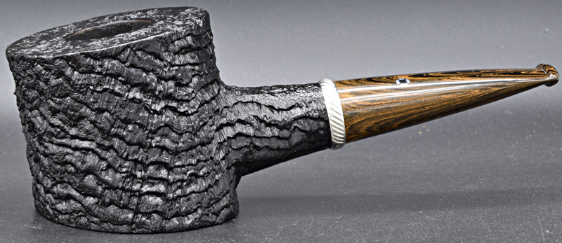 *** USA SALES ONLY*** Unfortunately I will not be able to make any international sales until further notice. Any attempt for purchase other than USA will be canceled and payment refunded with buyer responsible for any PayPal fees.***My 2800th pipe! A fitting shape for the milestone since I like the Poker shape so much. Not quite as tall as I usually make them and it is wider than it is tall. Nice thick walls on the piece and the blast came out incredible. The black stain compliments the mouthpiece very well and of course it is a sitter. Hand cut Tan Cumberland mouthpiece w/Delrin tennon, hand made solid sterling silver “Wide Rope” fitment. Thank you very much for looking and your consideration of my work.